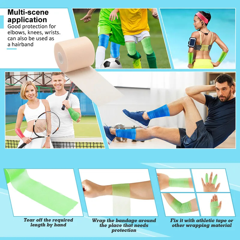 - Applications polyvalentes : pré-enveloppez sous du ruban athlétique, maintenez les coussinets et les compresses froides, évitez les frottements, fixez les protège-tibias ou créez des bandeaux temporaires.